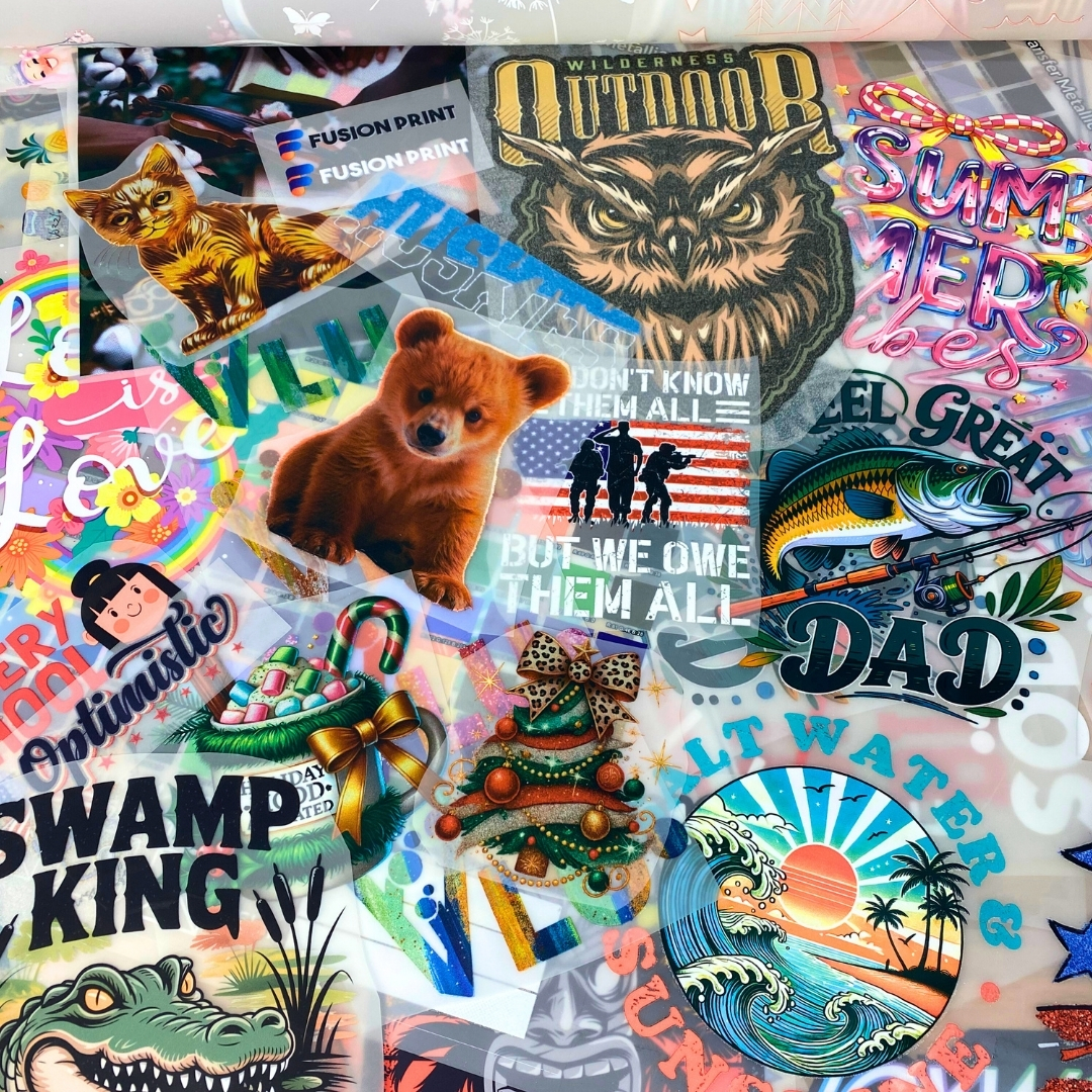 Explore the full potential of Fusion Print’s DTF and UV DTF transfer technologies, designed to deliver exceptional versatility and flawless results. Each sample showcases our seamless application options — including hot peel, glitter, and metallic finishes — engineered for precision, durability, and aesthetic brilliance.