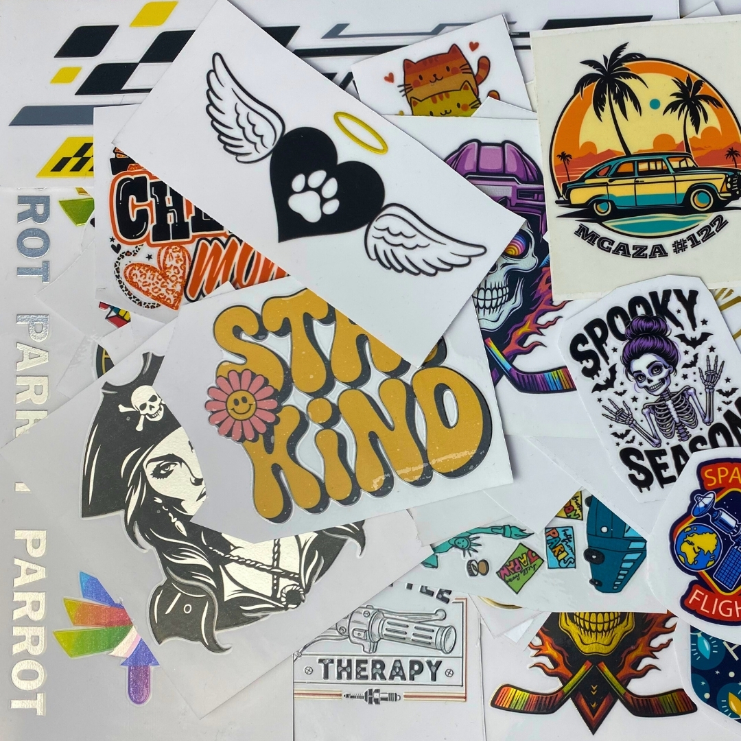 Explore the full potential of Fusion Print’s DTF and UV DTF transfer technologies, designed to deliver exceptional versatility and flawless results. Each sample showcases our seamless application options, including hot peel, glitter, and metallic finishes — engineered for precision, durability, and aesthetic brilliance.